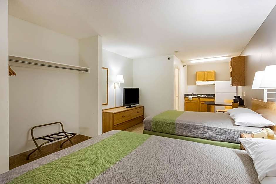 Room includes a kitchenette and cable TV.